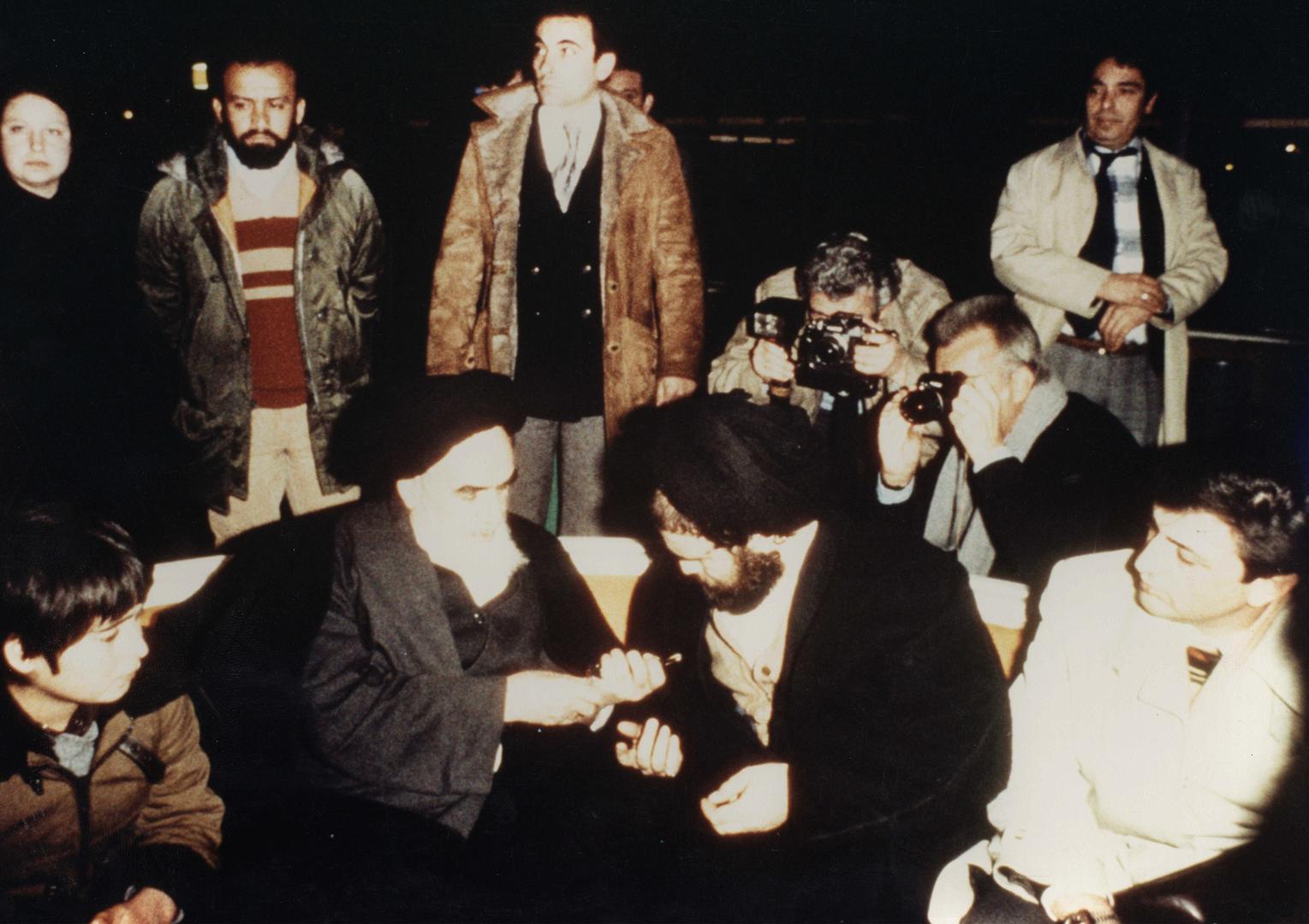 امام خمینی در فرودگاه پاریس لحظاتی پیش از سوار شدن به هواپیما و حرکت به سوی ایران
